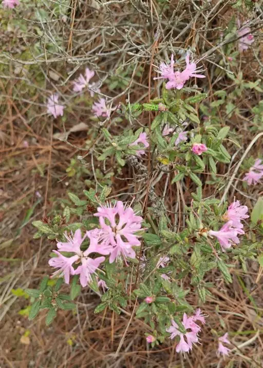 碎米花(学名:Rhododendron spiciferum Franch.):小灌木,高0.2--2米,多分枝,枝条细瘦。幼枝密被灰白色短柔毛和伸展的长硬长,以后渐脱落。叶散生枝上,叶片坚纸质,狭长圆形或长圆状披针形,上面深绿色,密被短柔毛和长硬毛,下面黄绿色,密被灰白色短柔毛。花芽数个,生枝顶叶腋,芽鳞外被灰白色绢毛并密生鳞片,边缘密被短纤毛,花开时仍不落;花序短总状,有花3-4朵;花冠漏斗状,长1.3-1.6厘米,粉红色,外面疏生腺鳞,于中部以上5裂。蒴果长圆形,被毛和鳞片。花期2-5月。