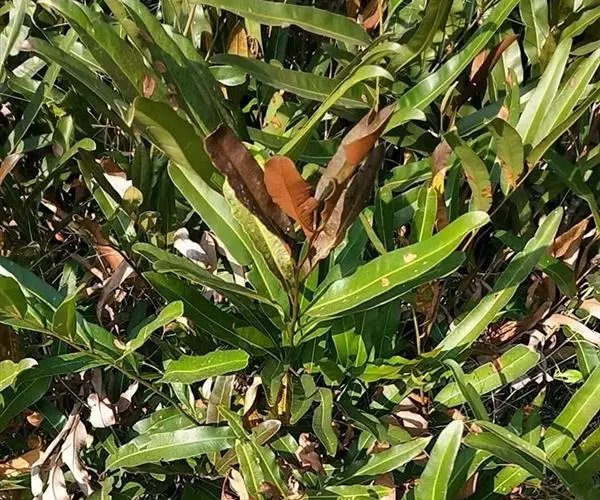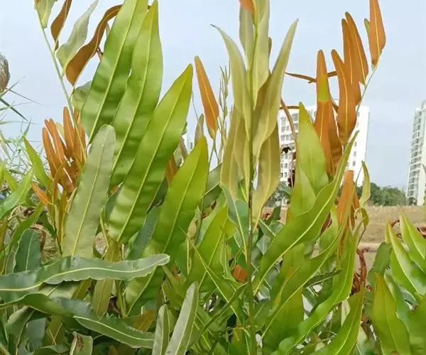 卤蕨(学名:Acrostichum aureum L.)是卤蕨科,卤蕨属植株高可达2米。根状茎直立。叶簇生,叶柄基部褐色,被钻状披针形鳞片,羽片多,基部一对对生,长舌状披针形,叶厚革质,干后黄绿色,光滑。孢子囊满布能育羽片下面,无盖。
