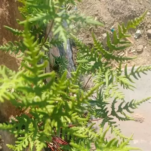 植株高15-30厘米。根状茎直立或斜升(偶有沿石缝横走)先端被披针形,棕色、有光泽的鳞片。叶簇生;叶柄长10-20厘米,粗约7毫米,红棕色、有光泽,上部光滑,基部疏被棕色披针形鳞片;叶片五角形,长宽几相等,约5-7厘米,先端渐尖,羽片3-5对,基部三回羽裂,中部二回羽裂,上部一回羽裂;基部一对羽片直角三角形,长3-5厘米,宽2-4厘米,水平开展或斜向上,基部上侧与叶轴合生,下侧不下延,小羽片3-4对,以圆缺刻分开,基部以狭翅相连,基部下侧一片最大,长2-2.5厘米,宽0.5-1厘米,长圆披针形,先端长渐尖,有裂片3-4对;裂片三角形或镰刀形,基部一对较短,羽轴上侧小羽片较短,不分裂,长仅1厘米左右;第二对羽片为不整齐的一回羽裂,披针形,基部下延成楔形,往往与基部一对羽片汇合,先端长渐尖,有不整齐的裂片3-4对;裂片三角形或镰刀形,以圆缺刻分开;自第二对羽片向上渐次缩短。叶干后草质或薄革质,上面褐色、光滑,叶脉不显,下面被乳白色或淡黄色粉末,裂片边缘有明显而均匀的细齿牙。孢子囊群较多;囊群盖连续,狭,膜质,黄绿色,全缘,孢子极面观为钝三角形,周壁表面具颗粒状纹饰。