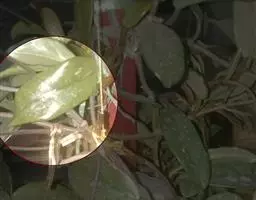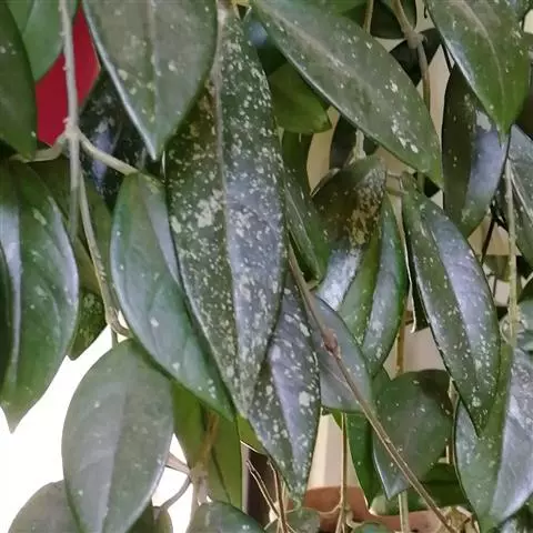 介壳虫常寄生在叶片叶鞘和茎上,特别是在叶鞘叶背等阴暗处,以刺吸式口器深入植株的气孔吸取营养,对球兰生长影响极大,致使苗株逐渐衰退、黄化,且易感染病害而致死亡。夏季高温多雨,通风不良或日光不足,极易发生介壳虫危害。