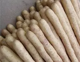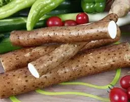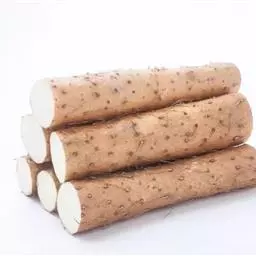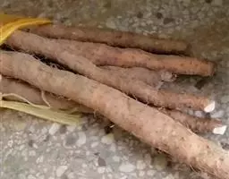 呈不规则圆柱形,长7~14cm,直径2~4cm,表面浅棕黄色至棕黄色,有纵皱纹,常有未除尽的栓皮痕迹,质坚实,断面淡黄色,散有少量淡棕色小点。无臭,味甜微酸,有粘性。显微鉴别块茎横切面:外皮已除去,薄壁组织中散有含草酸钙针晶束的粘液细胞,以皮层为多,粘液细胞长径86~120μm,草酸钙针晶长约100μm,中柱鞘有石细胞组成的环层,石细胞直径13~34μm,内含草酸钙方晶。后生木质部导管直径约35μm。薄壁细胞内充满淀粉粒,淀粉粒类圆形、卵圆形、不规则形,大粒层纹明显。