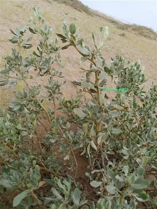 沙冬青 常绿灌木,高1.5-2米,粗壮;树皮黄绿色,木材褐色。茎多叉状分枝,圆柱形,具沟棱,幼被灰白色短柔毛,后渐稀疏。3小叶,偶为单叶;叶柄长5-15毫米,密被灰白色短柔毛;托叶小,三角形或三角状披针形,贴生叶柄,被银白色绒毛;小叶菱状椭圆形或阔披针形,长2-3.5厘米,宽6-20毫米,两面密被银白色绒毛,全缘,侧脉几不明显。