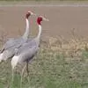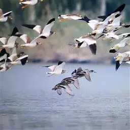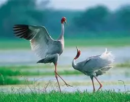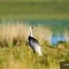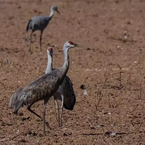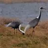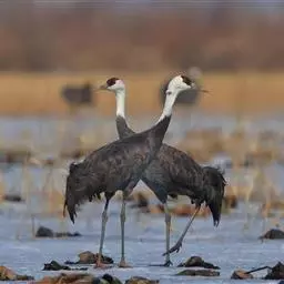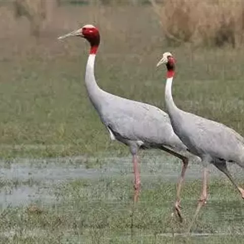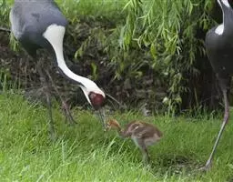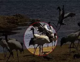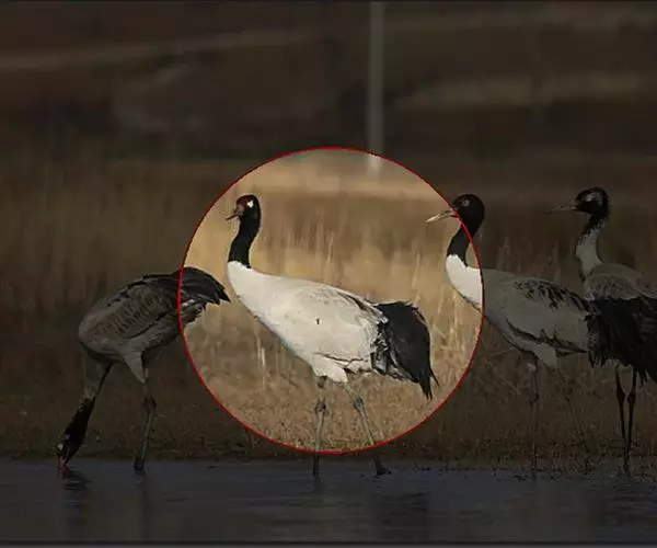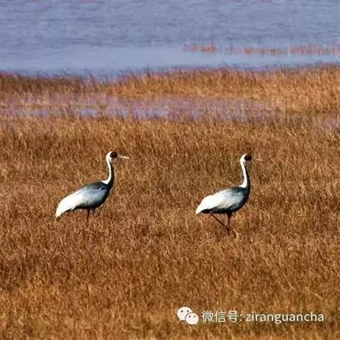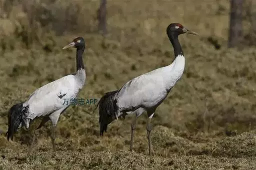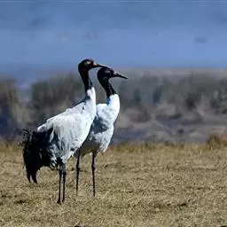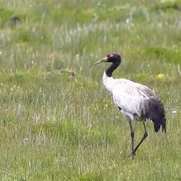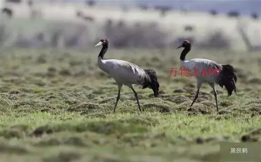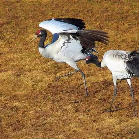 黑颈鹤(学名:Grus nigricollis):大型涉禽,体长110-120厘米,体重4-6千克。颈、脚甚长,通体羽毛灰白色,头部、前颈及飞羽黑色,眼先和头顶前方裸露的皮肤呈暗红色,尾羽褐黑色。头顶,三级飞羽的羽片分散,当翅闭合时超过初级飞羽。虹膜黄褐色,嘴肉红色,尖端沾黄,腿和脚灰褐色。