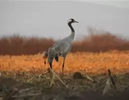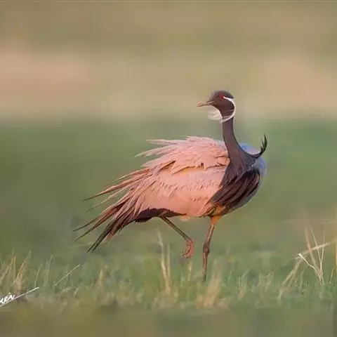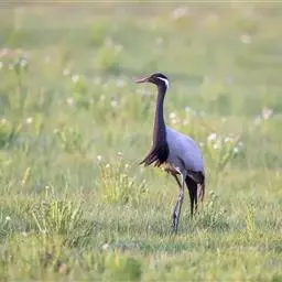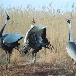 蓑羽鹤大型涉禽,体长68~92厘米,是鹤类中个体最小者。通体蓝灰色,眼先、头侧、喉和前颈黑色,…