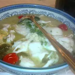 7、将腌好的鱼片逐片放入汤中,用筷子拨散,等鱼片煮变色,用盐、糖、鸡精、胡椒粉调味,用深盘盛出,烧少许热油浇在鱼片上即可。
