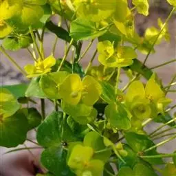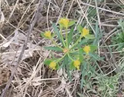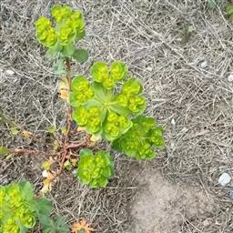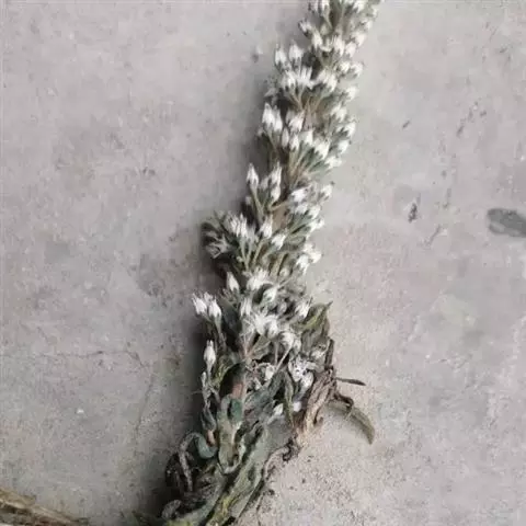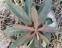 大狼毒:又名搜山虎、土瓜狼毒。多年生草本,高35-55cm。全株含白色乳汁。根圆锥状或圆柱状,直径1-3cm,外皮淡褐色,无侧根或有少数侧根。茎簇生或单一,圆柱形,绿白色,红色或下部绿白而上部有紫红晕,不分枝或上部有分枝。单叶互生;无柄;叶片椭圆状披针形,椭圆状长圆形、披针形至长卵形,长2-5.8cm,宽0.7-1.9cm,先端短尖而钝,基部楔形,全缘,上面绿色,下面灰绿色,有时带红晕。花浅黄色,花序顶生或近顶腋生;顶生花序具5-9枚花梗排列成伞形,基部具5-9枚叶状苞片,成两轮;腋生花梗单一,花梗顶端着生一杯状花序或再作2-4伞状分枝;总苞淡绿黄色,具纵棱,先端5裂,裂片倒卵形,先端微凹或全缘;外侧腺体4-5枚,长圆形,橘红色或杏黄色,内面具白丝毛;雄花多数,通常1-3雄蕊伸出腺体之上,花丝顶端分叉成2个花药;中间雌花1朵,花梗较花丝长,伸出总苞外,子房近球形,密被刺毛,花柱3枚,柱头2叉。蒴果三棱状球形,具小疣状突起及红色刺毛;种子卵形,赭红色,长约5mm,一端具明显白色种阜。花期夏季。