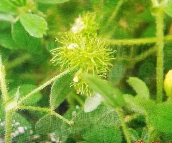 荚果球形,旋转3-5圈,直径2.5-4.5毫米,边缝具3条棱,被长棘刺,通常长等于半径,水平伸展,尖端钩状;种子每圈有1-2粒。种子长肾形,长1.5-2毫米,棕色,平滑。花期3-4月,果期4-5月。