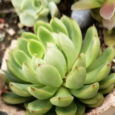 立田锦多肉,易群生的景天科拟石莲花属和厚叶草属杂交多肉品种。茎直立,株高30厘米以内,其叶排列呈莲…