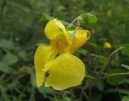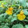 水金凤(学名:Impatiens noli-tangere Linn.):是凤仙花科,凤仙花属一年生草本植物,高可达70厘米。茎肉质,直立,叶互生;叶片卵形或卵状椭圆形,边缘有粗圆齿状齿,上面深绿色,下面灰绿色;叶柄纤细,总状花序;苞片草质,披针形,花黄色;侧生萼片卵形或宽卵形,旗瓣圆形或近圆形,翼瓣无柄,唇瓣宽漏斗状,花丝线形,花药卵球形,顶端尖;子房纺锤形,蒴果线状圆柱形,种子多数,7-9月开花。