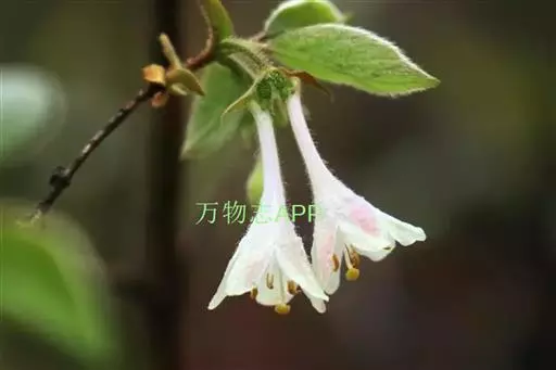 北京忍冬 落叶灌木,高达3米多;幼枝无毛或连同叶柄和总花梗均被短糙毛,刚毛和腺毛,二年生小枝常有深色小瘤状突起。冬芽近卵圆形,有数对亮褐色、圆卵形外鳞片。叶纸质,卵状椭圆形至卵状披针形或椭圆状矩圆形,长(3-)5-9(-12.5)厘米,顶端尖或渐尖;两面被短硬伏毛,下面被较密的绢丝状长糙伏毛和短糙毛;叶柄长3-7毫米。