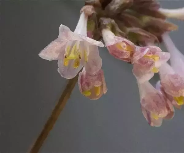 花与叶同时开放,总花梗出自二年生小枝顶端苞腋,长0.5-2.8厘米;苞片宽卵形至卵状披针形或披针形,长(5-)7-10毫米,下面被小刚毛;相邻两萼筒分离,有腺毛和刚毛或几无毛,萼檐长1-2毫米,有不整齐钝齿,其中1枚较长,有硬毛及腺缘毛或无毛;花冠白色或带粉红色,长漏斗状,长(1.3-)1.5-2厘米,外被糙毛或无毛,筒细长,基部有浅囊,裂片稍不整齐,卵形或卵状矩圆形,长约为筒的1/3;雄蕊不高出花冠裂片;花柱稍伸出,无毛。果实红色,椭圆形,长10毫米,疏被腺毛和刚毛或无毛;种子淡黄褐色,稍扁,矩圆形或卵圆形,长3.5-4毫米,平滑。花期4-5月,果熟期5-6月。