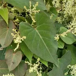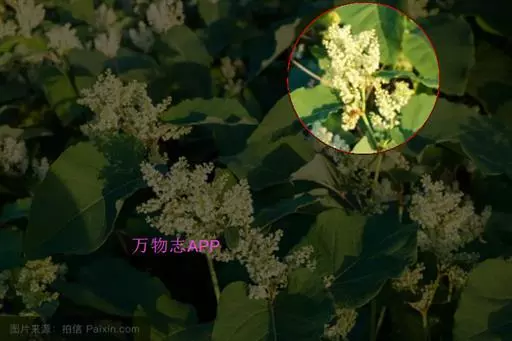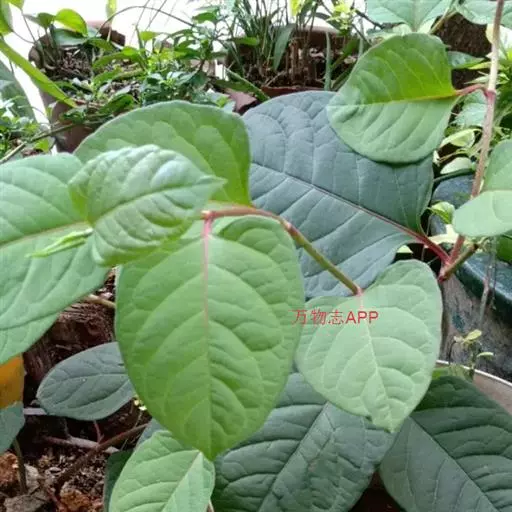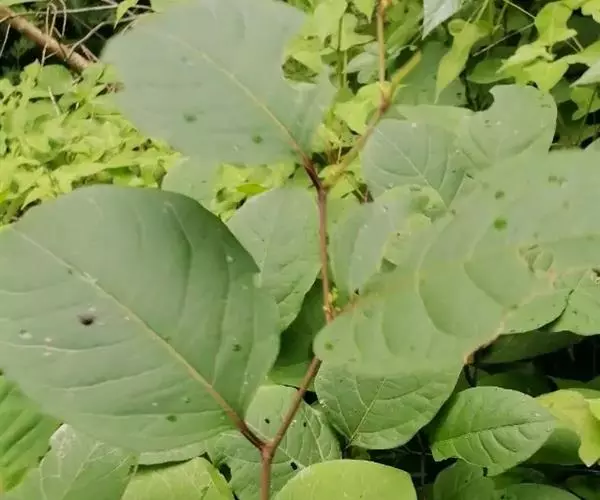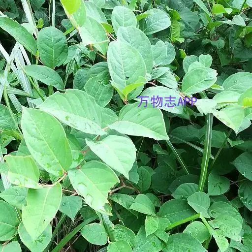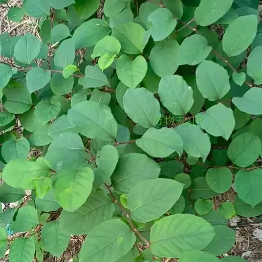 虎杖(学名:Reynoutria japonica Houtt.):蓼科,虎杖属多年生草本植物。根状茎粗壮,茎直立,高可达2米,空心,叶宽卵形或卵状椭圆形,近革质,两面无毛,顶端渐尖,基部宽楔形、截形或近圆形,托叶鞘膜质,圆锥花序,花单性,雌雄异株,腋生;苞片漏斗状,花被淡绿色,瘦果卵形,有光泽黑褐色,8-9月开花,9-10月结果。