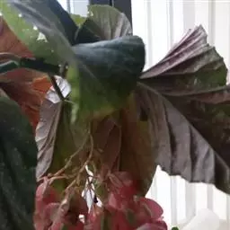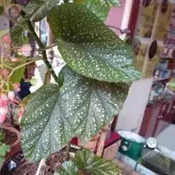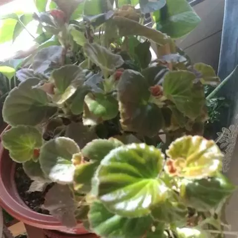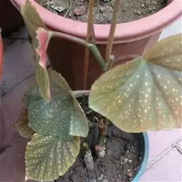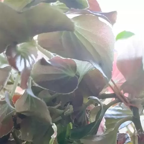 真菌病害,由葡萄孢菌引起的灰霉病症状:秋海棠叶片灰霉病经常发植株的下部,尤其是根茎处与基质接触的地方更容易感染病菌,被水浸润的病斑很快会扩散到整个叶整个植株,受害区域呈现坏死斑点,逐渐由褐色转变为黑色。当夜间温度较低、白天温度较高而且湿高时,病原孢子生长加快,受害的叶片上会长出灰绿色的霉状物。