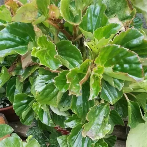 细菌性病害由斑点病菌引起的叶斑病症状:秋海棠非常容易被该种菌所侵染,但是许多生产者对之没有足够的重视,并不认为这是一种病症,因为叶片边缘坏死和叶片斑点是最常见的,几乎所有类型的秋海棠都曾经出现过这种情况。