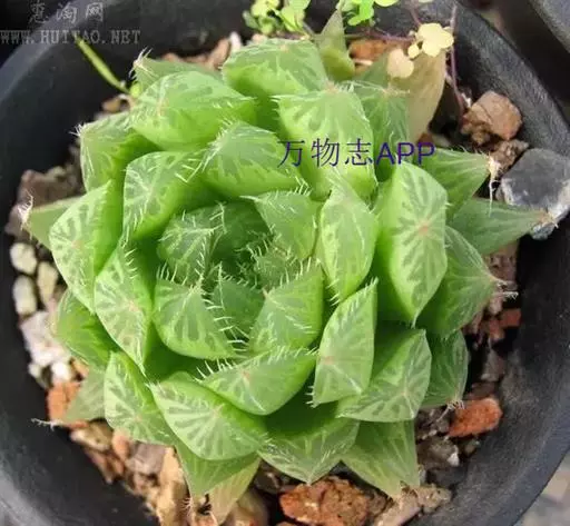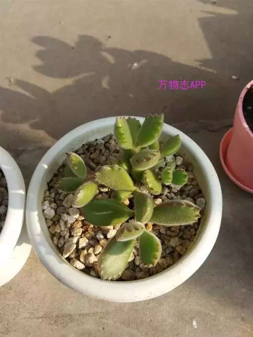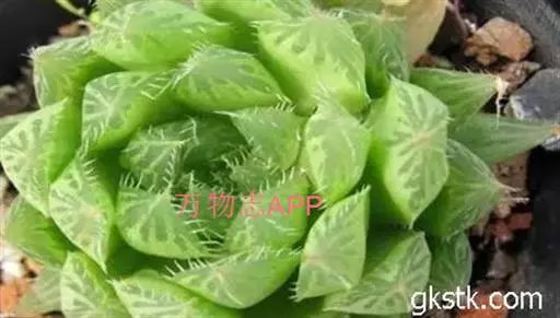 植株矮小,株高一般5~6厘米。叶片互生,长圆形或匙状,肉质肥厚,生于极短的茎上,紧密排列为莲座状,叶色翠绿色,叶肉呈半透明状,叶面有8~12条暗褐色条纹或中间有褐色、青色的斑块,叶缘粉红色,有细锯齿。顶生总状花序,花极小。是常见的多肉植物之一。