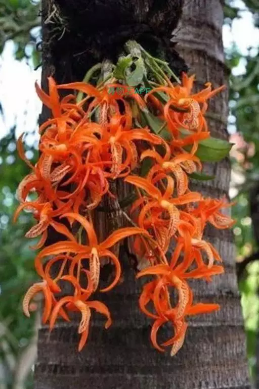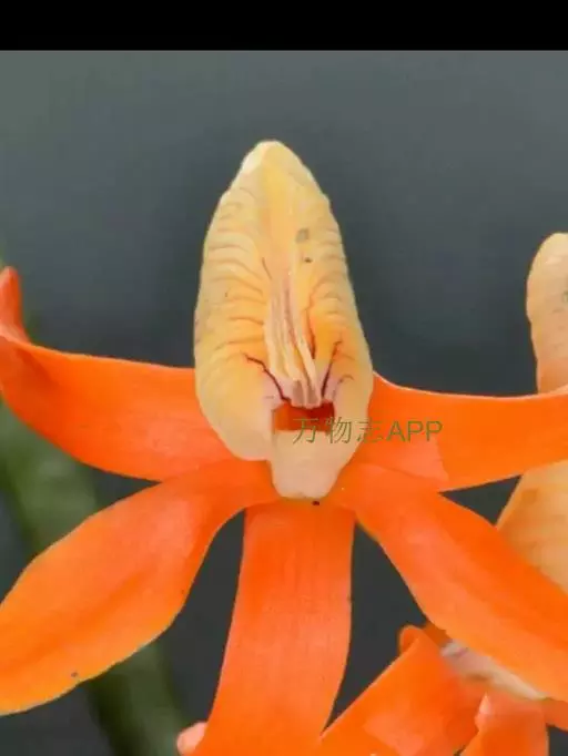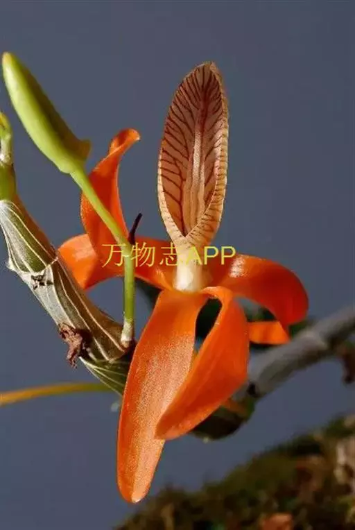 独角石斛,Dendrobium unicum,兰科石斛属植物。花瓣橙黄色,唇瓣反转似犀牛角,布有橘红色网纹。