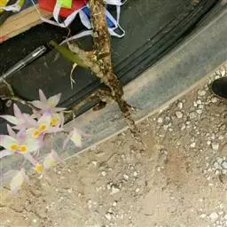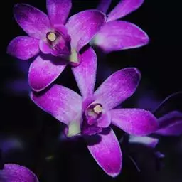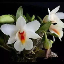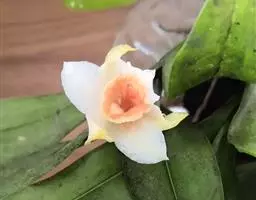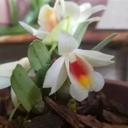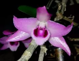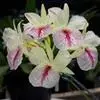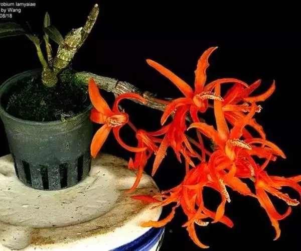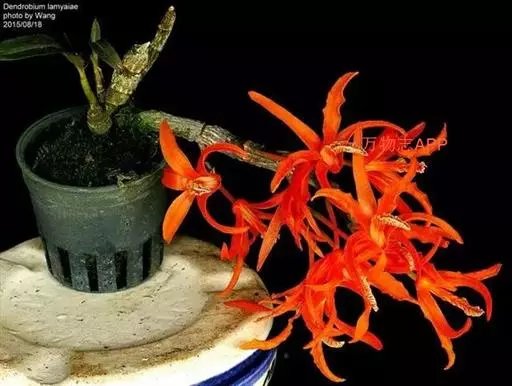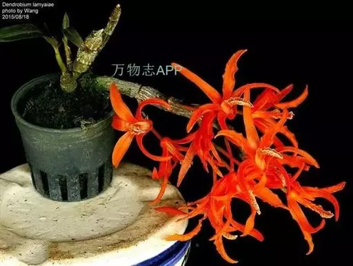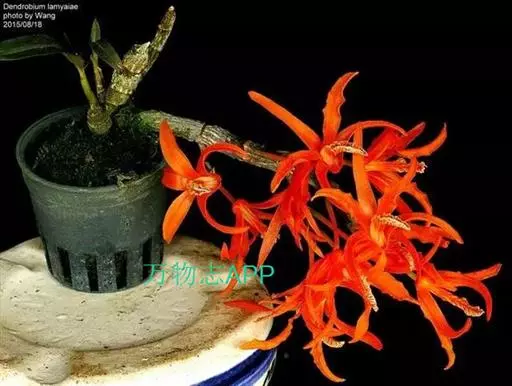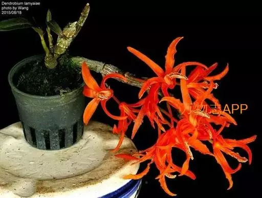其唇瓣反转似犀牛角,布有深橙红色网纹,非常独特。这是个非常吸引人的小型种,目前已成为mini春石斛兰与非典型春石斛兰的重要亲本,虽然它没有饱满圆整的花型,但是花瓣橙红色与唇瓣上筋状网脉的遗传使得它异军突起,逐渐受到追捧。