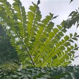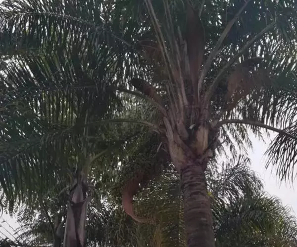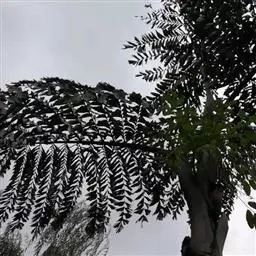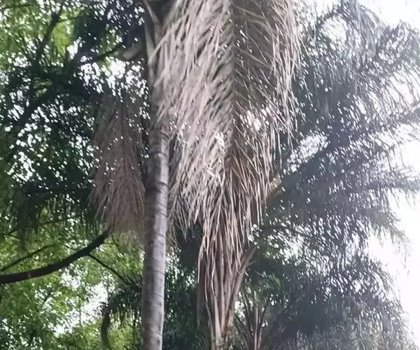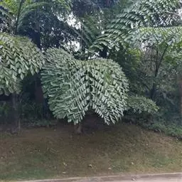 乔木状,干高10-15米,直径20-40厘米。叶羽状全裂,长4-5米,羽片多,每2-5片靠近成组排列成几列,每组之间稍有间隔,线状披针形,最大的羽片长95-100厘米,宽约4厘米,顶端的稍疏离,较短,狭成线形(宽约2厘米),具1条明显的中脉,横脉细而密,两面及边缘无刺,背面中脉上被鳞秕,羽片先端浅2裂;叶柄及叶轴被易脱落的褐色鳞秕状绒毛。