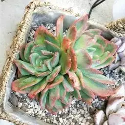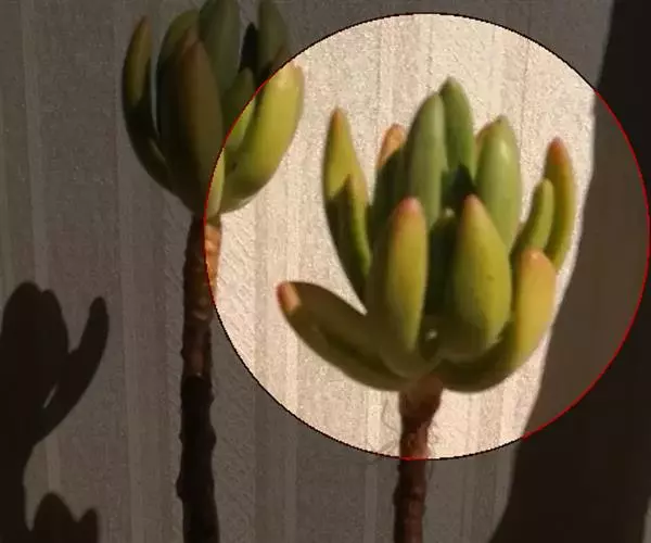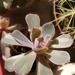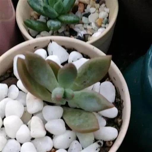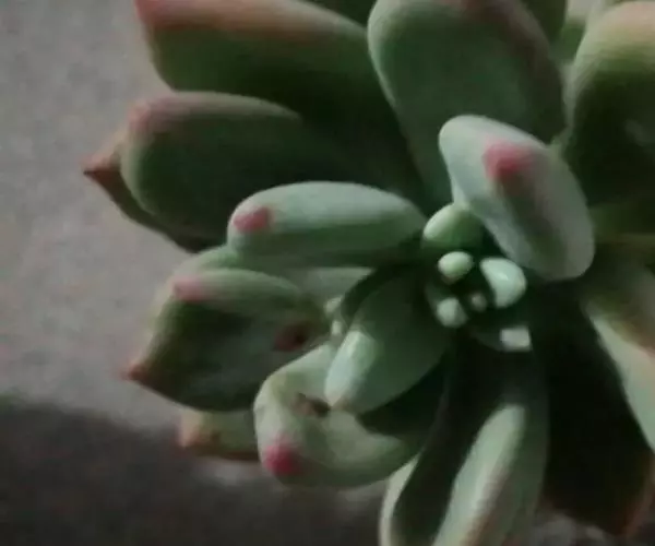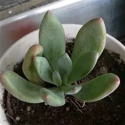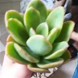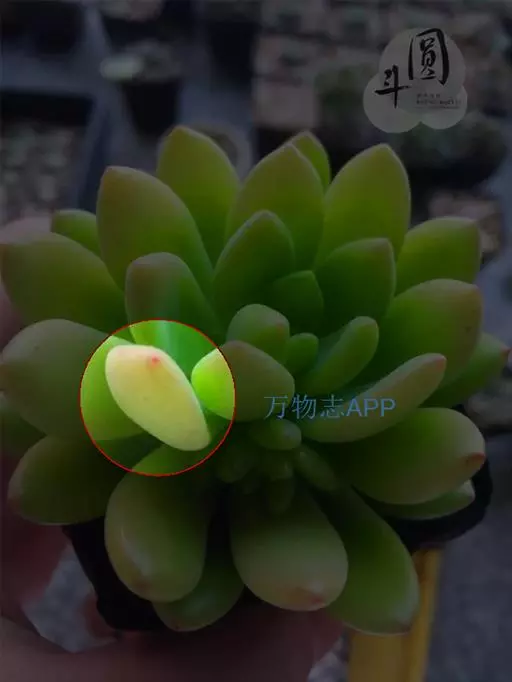 植株叶片莲座状排列,匙型,有叶尖,叶缘圆弧状,叶片肥厚,叶片光滑微量白粉,叶片草绿色至墨绿色。阳光充足叶片紧密排列边缘和叶尖会发红,弱光则叶色浅绿,叶片变的窄且长,叶片间的间距会徒长拉长。春秋是生长旺季。