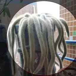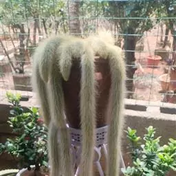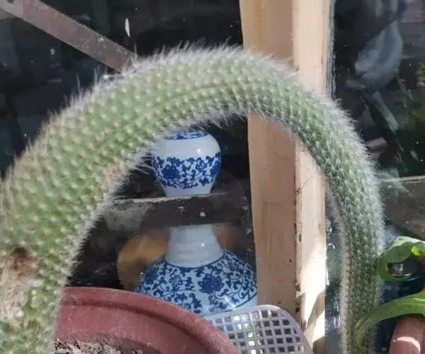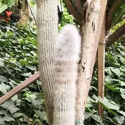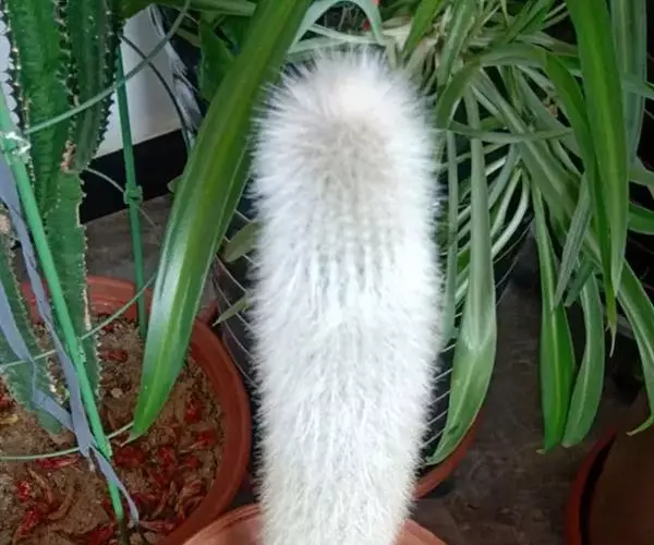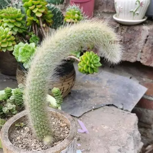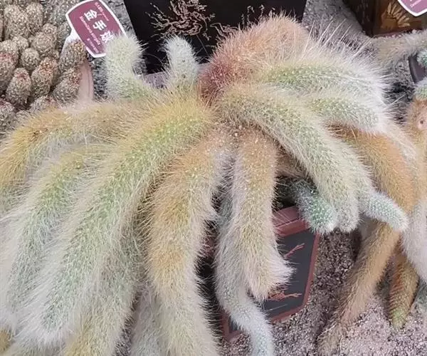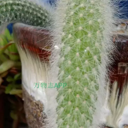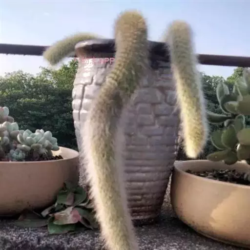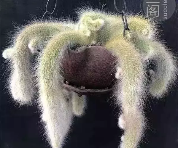 猴尾柱长长的尾巴 多年生的长柱状垂挂型肉质植物。刺软质,色白,如同厚厚的动物绒毛。外形与黄金纽酷似,但是黄金纽刺为黄色,且更短,更硬质。花为玫红色,花瓣边缘泛白色,且易开花,栽培得当整个夏天可以持续开花,花形与仙人指的花相似,但是猴尾柱得花要更大。它的果实隐藏在软刺之中,起到了保护作用。