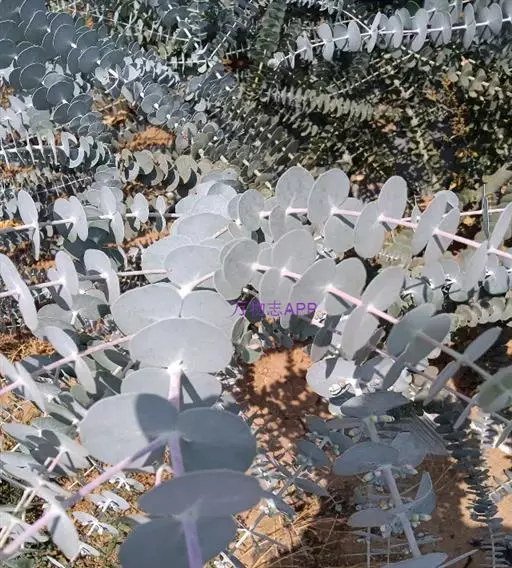 银叶桉是常绿灌木或小乔木,株高可达3米。幼叶对生,无柄,阔卵形或阔盾形;老叶互生,呈披针形,两面均被白粉,银绿色。