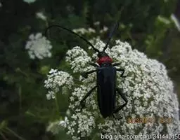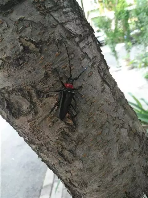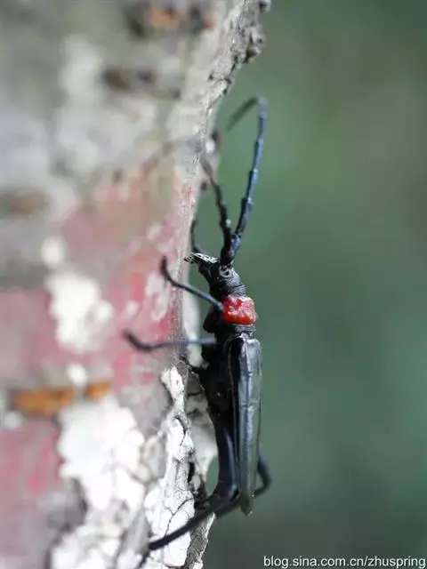 桃红颈天牛是天牛科、颈天牛属昆虫。体黑色发亮,前胸背面大部分为光亮的棕红色或完全黑色。头黑色,…