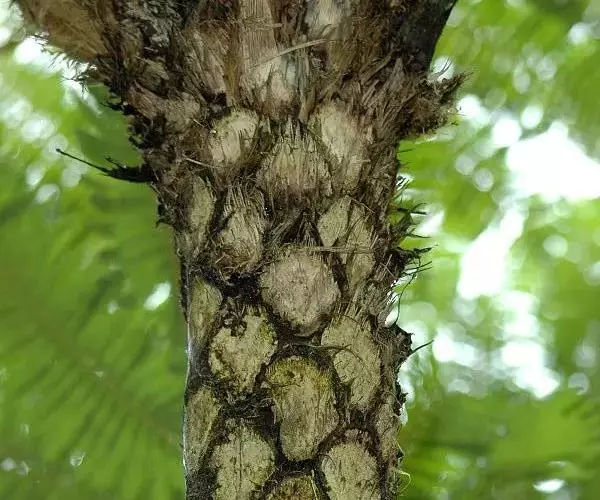笔筒树的老叶脱落后,会在茎干上留下一个个略呈三角形的椭圆形叶痕,树干截面多为椭圆形,叶柄如蛇形,整个树干看起来就像是蛇一般,所以又有“蛇木”这个称号。