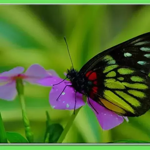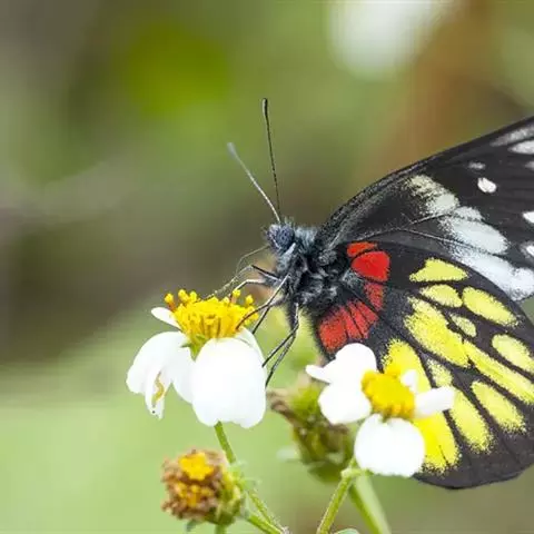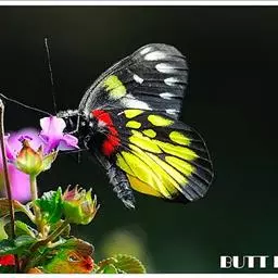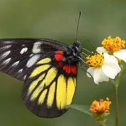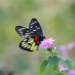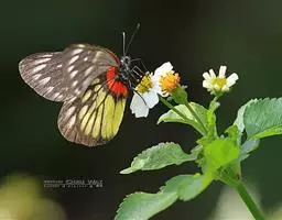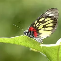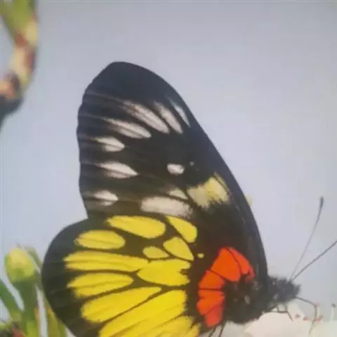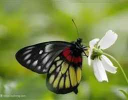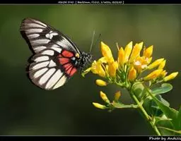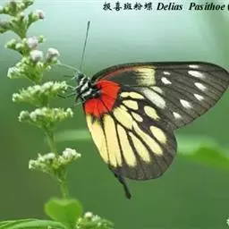 红肩粉蝶,Delias pasithoe curasena,属粉蝶科斑粉蝶属的一个物种。翅膀背面以黑褐色为主,只在翅面上有一些蓝白色小斑或鳞块,雄蝶并于后翅内缘附近有块鲜黄色区;腹面以黑褐色为底色,前翅上有明显的蓝白色斑纹,后翅则有许多鲜黄色斑块,而于翅基有血红色纹彩。
