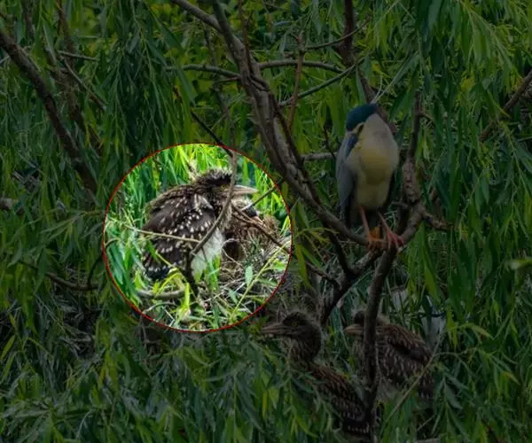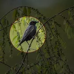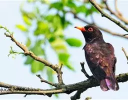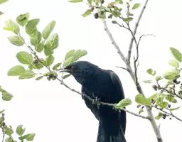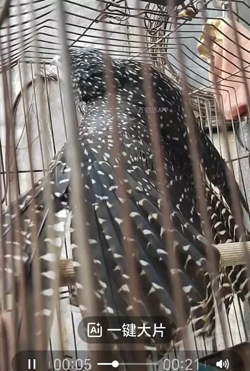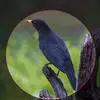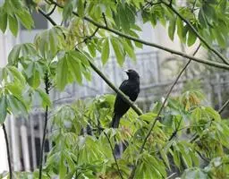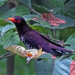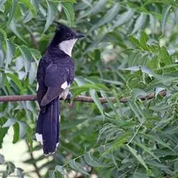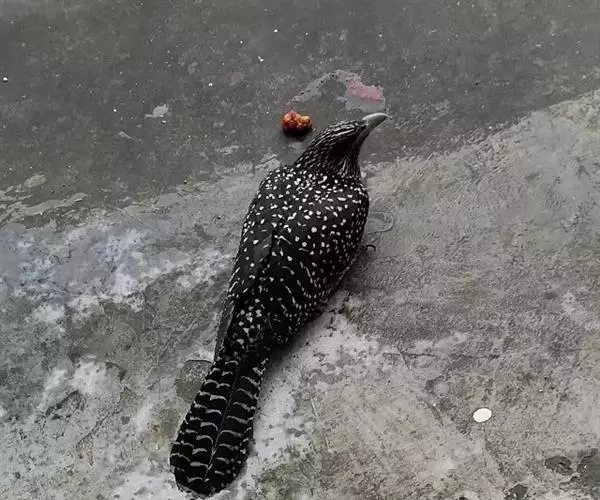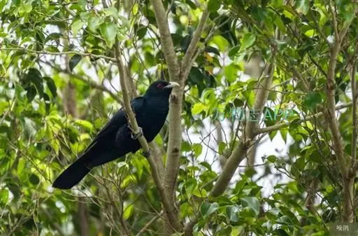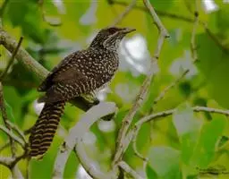 噪鹃(学名:Eudynamys scolopaceus):体长39-46厘米,约重350克。属中型鸟类。雄鸟通体黑色,具蓝色光泽,下体沾绿。雌鸟上体暗褐色,略具金属绿色光泽,并满布整齐的白色小斑点;头部白色斑点略沾皮黄色,且较细密,常呈纵纹状排列。背、翅上覆羽及飞羽,以及尾羽常呈横斑状排列。颏至上胸黑色,密被粗的白色斑点,其余下体白色,具黑色横斑。