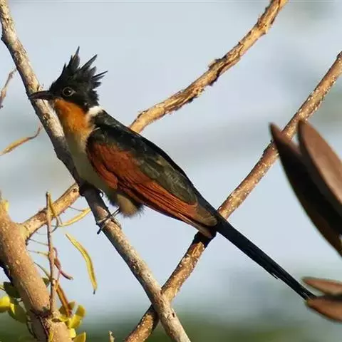 斑翅凤头鹃: 成鸟具羽冠,上体及头侧、翅、尾等黑色,具铁绿色亮辉,尾羽端部具白斑,两侧者形宽,…