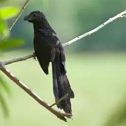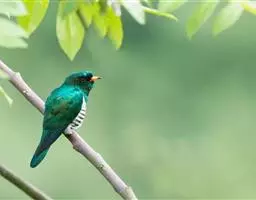 绿嘴地鹃:体形似小鸦鹃,但羽色大致绿灰;嘴绿色,头侧眼的周围有一裸区;后爪弯曲。虹膜赤红色,…