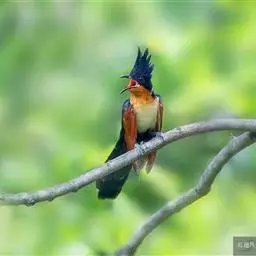 红翅凤头鹃:体长约38厘米,顶冠及凤头黑色,具显眼的直立凤头,背及尾黑色而带蓝色光泽,翅栗红色,…
