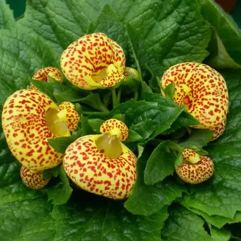 总状花序着生于分枝顶端,长约100cm,伞房状。基部呈袋状。色彩多变,有白,淡黄白、淡黄、深黄、橙红、深红和玫紫等;喉部黄色,有深色斑点和须毛。