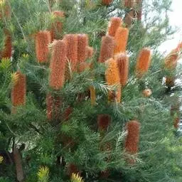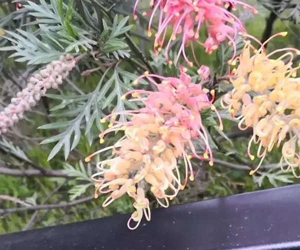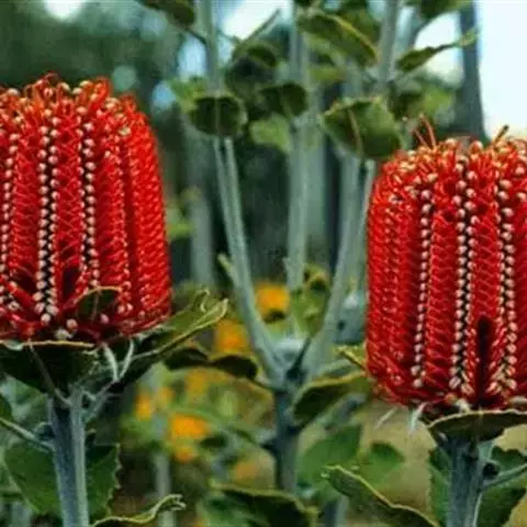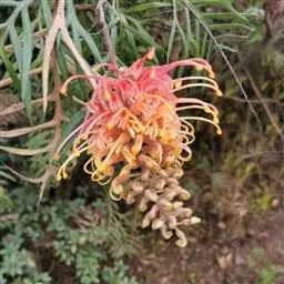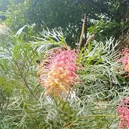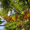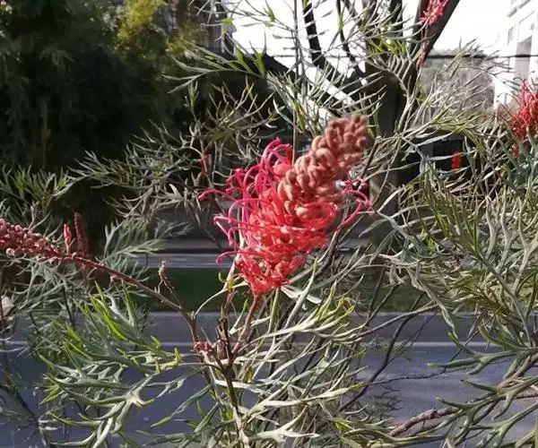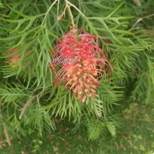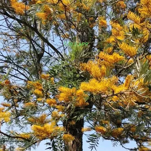 银桦(Grevillea robusta)大乔木,高可达20米;幼枝被锈色茸毛。叶为2回羽状深裂,裂片5-10对,披针形,常5-10厘米,两端均渐狭,第2次裂片全缘或再分裂,上面秃净而亮或薄被丝毛,背密被银灰色丝毛,边缘背卷。花呈橙黄色,为总状花序,此等花序单生或数个聚生于无叶的短枝上,长7-15厘米,多花,花柄长8-12毫米,极扩展或稍下弯,秃净,花被长约1厘米;子房秃净,具柄。花期:5月。果:卵状矩圆形,多少偏斜,长14-16毫米。宽6-8毫米,稍压扁,常冠以宿存的花柱。种子倒卵形,周边有翅。