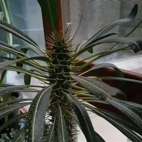 茎干类多肉美花美型种,植株块茎酒瓶状,株高1.5-2M,株幅1M。茎干基部膨大上粗下细,分枝棒状,表皮银白色。散生长刺,3刺一簇灰褐色。绿色叶4-8厘米长,3厘米宽,簇生茎端似伞状。略有短毛。花高脚碟状,白色或淡红色,花瓣中间夹有红条纹。花期夏季。