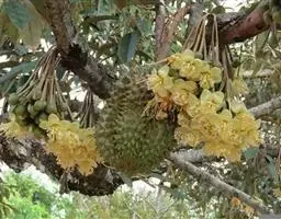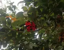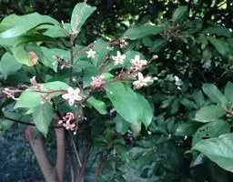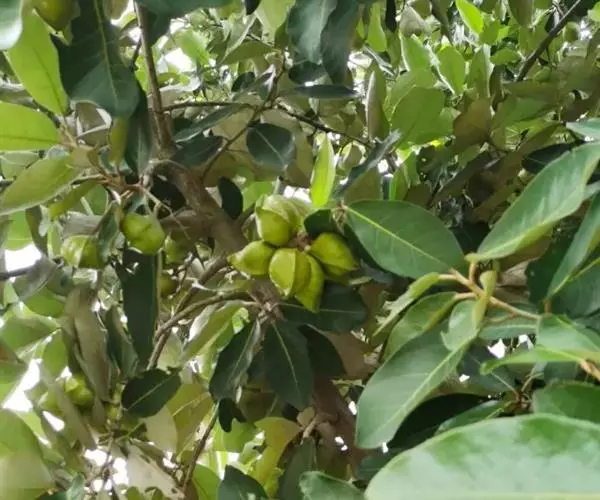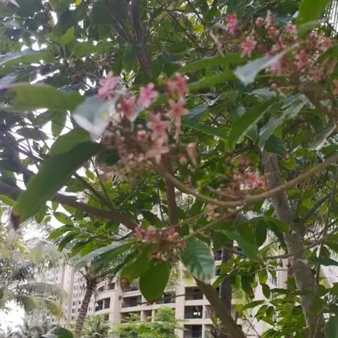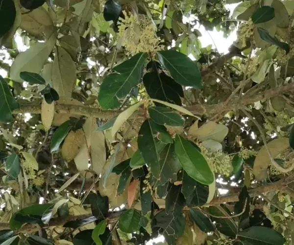 圆锥花序腋生,长约8厘米,密被星状毛和鳞秕;花红褐色;萼钟状,长4-6毫米,两面均被星状毛,5浅裂,裂片三角形,长约2毫米;雄花的花盘较薄,有乳头状突起,雌雄蕊柄短而无毛,花药4-5个在雌雄蕊柄顶端排成一环;雌花的心皮4-5枚,柱头与心皮同数且短而向下弯。果木质,坚果状,近椭圆形,光滑,干时黄褐色,长约6厘米,宽约3.5厘米,背部有龙骨状突起;种子卵形,长2厘米。花期夏季。