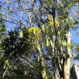 选择10年以上、生长良好、发育健壮、冠形良好、粗壮、无病虫害的实生母树,在9-12月采集自然成熟呈暗褐色的果实。果实采回后用清水冲洗干净后摊晒于阴凉通风处,人工剪去蒴果一小角(约占1/7,以不伤种子为准),再将种子泡浸于40-50℃温水中12小时左右,即可播种;若要在明春播种,则采用常温沙藏法,即采用洁净河沙,将洁净种子与河沙按1:5比例均匀混合,沙子湿度以用手握成团不出水、松手触之即散为准,每天适当洒水,保持湿润。