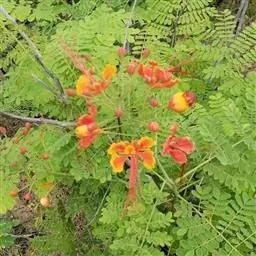 洋金凤 Sw.),豆科小凤花属灌木状或小乔木植物,枝无毛,绿或粉绿色;二回羽状复叶;总状花序伞房状,…