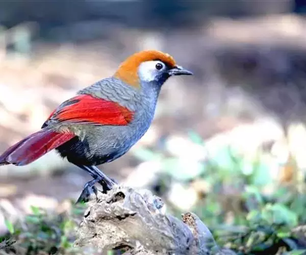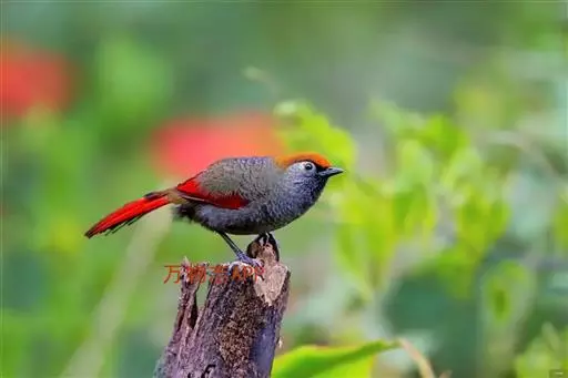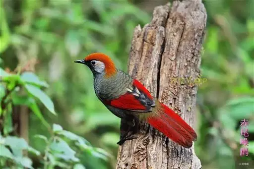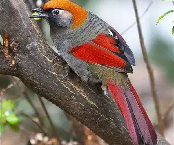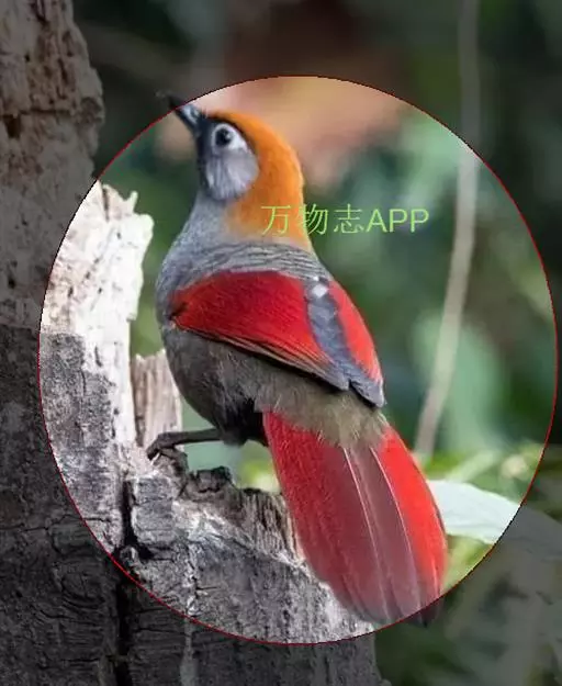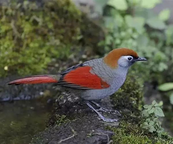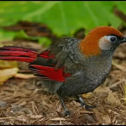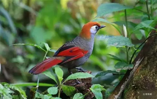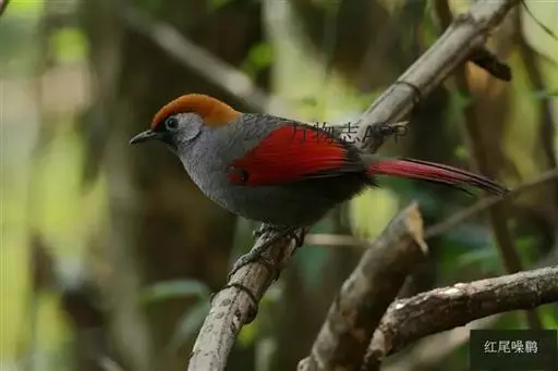 赤尾噪鹛(学名:Garrulax milnei)中型鸟类,体长24~28厘米。头顶至后颈红棕色,两翅和尾鲜红色,眼先、眉纹、颊、颏和喉黑色,眼后有一灰色块斑。其余上下体羽大都暗灰或橄榄灰色。特征极明显,特别是通过鲜红色的头顶、翅和尾。