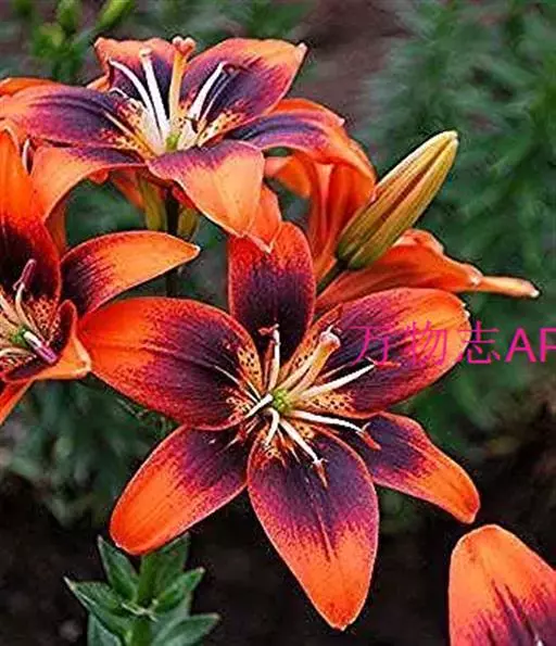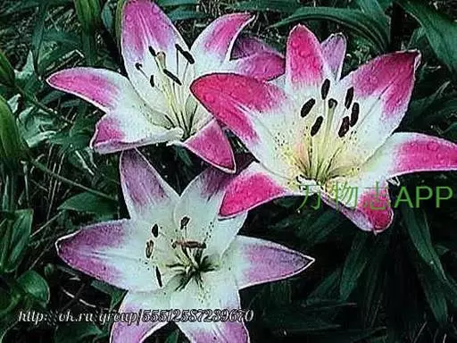 防治病 亚洲百合 虫害百合的病害主要有疫病、灰霉病、病毒病;百合虫害主要有蚜虫、斑潜蝇、地下各种害虫。疫病主要危害根茎部,同时也危害茎叶、花、种球,受害处出现水浸状斑,后变成褐色并皱缩,植株枯萎,茎从受害处折断而死亡,发病初期可喷40%乙磷铝300倍液、25%瑞毒霉500倍液。灰霉病是栽培中的常见病害,危害叶片、花蕾、茎和花,发病初期可用50%福美双可湿性粉剂600倍液喷雾,70%甲基托布津可湿性粉剂800倍液喷雾。病毒病危害主要表现为株矮、畸型、叶退绿斑点产生或白绿相间条带和坏死,叶扭曲、株丛生、花色变异,发病初期可用病毒宁可湿性粉剂500倍液喷雾,还可用金尔康200倍液、20%宁南霉素200~260倍液喷雾防治,同时彻底消灭蚜虫。地下害虫可采用毒谷、毒土防治。斑潜蝇可用70%潜克每667平方米10克,对水50千克喷雾防治,蚜虫可用10%比丹1500倍液喷雾防治
