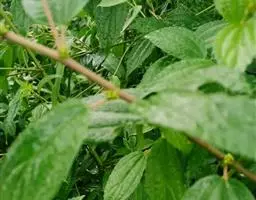 灌木或小乔木;小枝纤细,紫红色,干后变灰褐色或深灰色,密被细粗毛。叶卵状披针形,长3-5(-7)厘米,宽0.8-1.4(-2)厘米,先端渐尖或尾状渐尖,基部圆,稀浅心形,边缘有细锯齿,叶面深绿,干后变深灰绿色,极粗糙(因硬毛脱落后,残留的基部膨大且砂质化,而形成硬的乳凸状凸起所致),叶背浅绿色,干后变灰白色,密被灰短毡毛,在脉上有细粗毛和锈色腺毛,基出脉三条,侧生的二条长达叶片中部,侧脉2-4对;叶柄长2-5毫米,密被细粗毛。