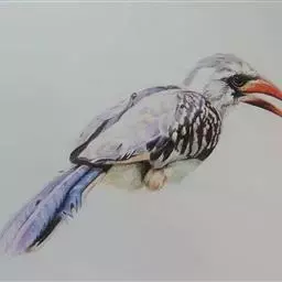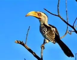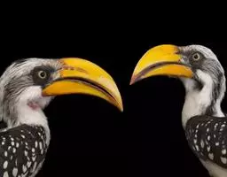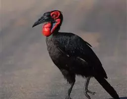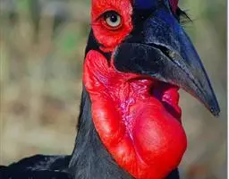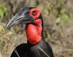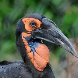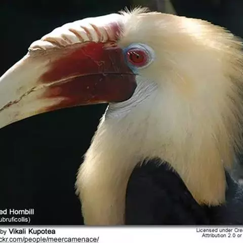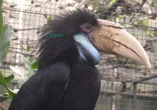 花冠皱盔犀鸟(学名:Rhyticeros undulatus)雄鸟体长约105厘米,雌鸟较小。尾白,雄雌两性的背、两翼及腹部均为黑色,但雄鸟头部奶白色,枕部具略红的丝状羽,裸出的喉囊上具明显的黑色条纹。雌鸟头颈黑,喉囊蓝色。
