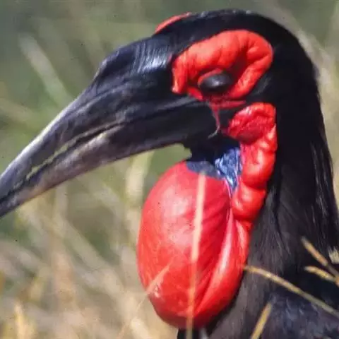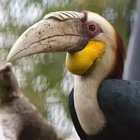 虹膜雄鸟橙红色至血红色,眼周裸露皮肤暗红至砖红色。雌鸟虹膜褐色或灰褐色。嘴象牙黄色,基部缀暗橙红色,雌鸟嘴亦为黄色。嘴缘有细锯齿状缺刻,上嘴基部有一较扁平的盔突,其上有6道皱褶隆起,形成“皱盔”。嘴基两侧各具数道斜形雕纹,脚绿色或石板黑色。