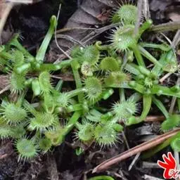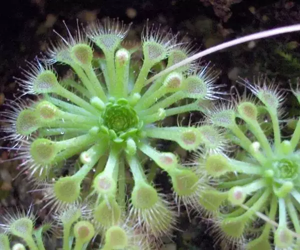 锦地罗 锦地罗的叶呈莲座状平铺地面,宽匙状 的叶,边缘长满腺毛,待昆虫落入,腺毛将虫体包围,带粘性的腺体将昆虫粘住,分泌的液体可分解虫体蛋白质等营养物质,然后由叶面吸收。