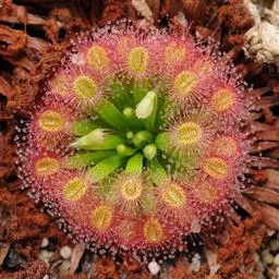 自然开花枯萎的锦地罗有一定几率长出几个新芽,更可靠的方法是播种。茅膏菜的种子大多细小如灰尘,播种时需小心。直接撒在湿润的水苔或泥炭上,保持高湿度和明亮光照,一个月左右便会萌发,待其长出足够多的真叶再分盆。锦地罗一般不用叶插法繁殖。