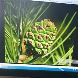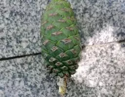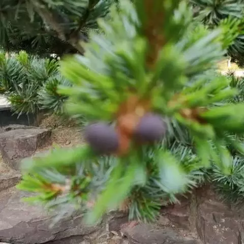 球果成熟前绿色,熟时褐色,圆锥状卵圆形或卵圆形,长4-6厘米,径3-4厘米,有短梗,向下弯垂;中部种鳞卵状椭圆形,鳞盾微肥厚,横脊显著,鳞脐微凹,有短刺;种子倒卵状椭圆形,长5-7毫米,径2-3.5毫米,连翅长1.5-1.8厘米,种翅灰褐色,有深色条纹;子叶5-10(多为7-8)枚,长2-4厘米,初生叶条形,长约2厘米,叶缘具疏生短刺毛,或近全缘。花期4-5月,种子第二年10月成熟。