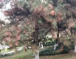 非生物因素 经调查发现另一个原因是自然因素,在黑松受到诸如旱涝、风折、高温高湿、冻害或因管理不善、营养不良等因素导致生长衰弱而引起病虫害发生,是该地区黑松死亡、树势衰弱的又一个重要原因。威海近几年来发生大风、风暴潮、雪灾、冻害的情况较以往年份多,特别是靠近大海的地方,遭受海风、海浪、海雾的侵害更多,而受灾严重的黑松大多在沿海分布,越靠近海岸受害越严重。自然灾害引起黑松树势衰弱,给病菌入侵创造了条件,使黑松感染枯枝病菌而造成枝叶枯黄,严重的造成树体死亡。