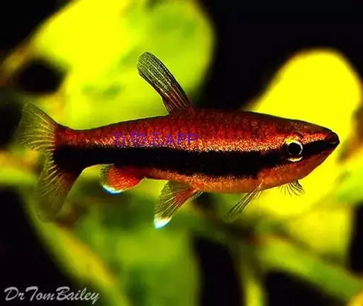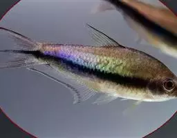 霓虹脂鲤的体色鲜艳华丽,背部橄榄绿。眼睛黑色,眼眶银蓝色镶有黑边,发出青绿色光 彩。在侧线上方从眼睛起延伸到尾柄,有一条浅蓝色霓虹彩的纵带,鲜艳夺目。纵带上方直至背部由棕色转为黑色,纵带下方臀鳍前为银白色。体后中央延至尾柄有一条鲜红色条纹。身上那条明亮的彩带在不同角度 的光线折射下,有时会显示绿色,有时则会显示蓝色,与身体上下部那条鲜红条纹配起来,红绿闪烁,加上臀鳍银白,颜色配合恰到好处,尤其是在灯光照耀的夜间水草造景水族箱中,几十尾霓虹脂鲤,成群结队, 顿使水草造景水族箱倍增光彩,如观焰火,魅力无穷,十分惹人喜爱。