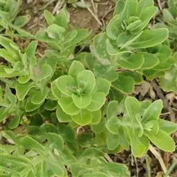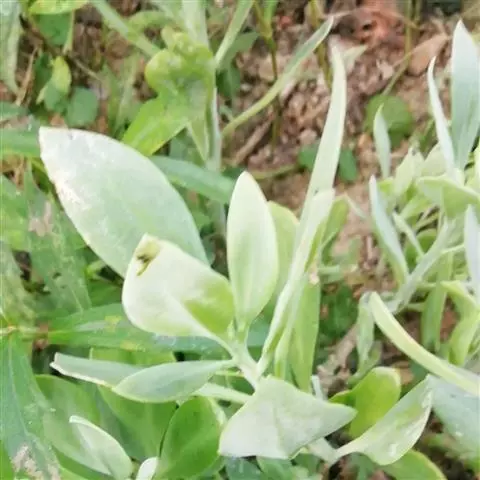 叶肉质肥厚,紫灰色,倒卵形,匙形或椭圆形,宽2.5-3.5厘米,长0.5-1.5厘米,叶尖尖锐,基部渐短粗,全缘,无毛,具白粉。