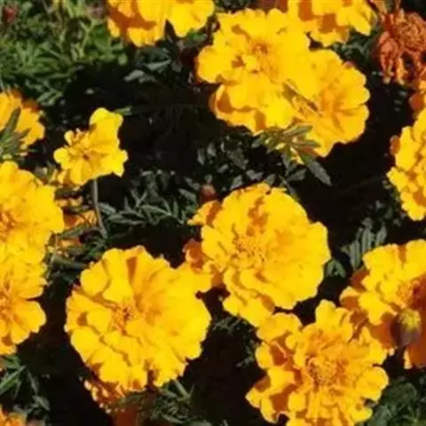 万寿菊是菊科万寿菊属一年生草本植物,别名孔雀菊、缎子花、臭菊花、西番菊、红黄草、小万寿菊、臭芙蓉、孔雀草。万寿菊茎近基部分枝。叶羽状分裂,长5-10厘米,宽4-8厘米,裂片长椭圆形或披针形,具锐齿,上部叶裂片齿端有长细芒,叶缘有少数腺体。头状花序单生,径5-8厘米,花序梗顶端棍棒状。总苞长1.8-2厘米,径1-1.5厘米,杯状,顶端具尖齿。舌状花黄或暗橙黄色,长2.9厘米,舌片倒卵形,长1.4厘米,基部成长爪,先端微弯缺。管状花花冠黄色,长约9毫米,冠檐5齿裂。瘦果线形,被微毛;冠毛有1-2长芒和2-3短而钝鳞片。花期7-9月。万寿菊中国各地均有栽培,在广东和云南南部、东南部已归化,国外原产墨西哥。万寿菊对土壤要求不严,但以肥沃疏松排水良好的土壤为好。耐移栽,种子发芽适温21-24℃,植株生长适合温度为20-29℃。喜温暖和阳光充足的环境,不